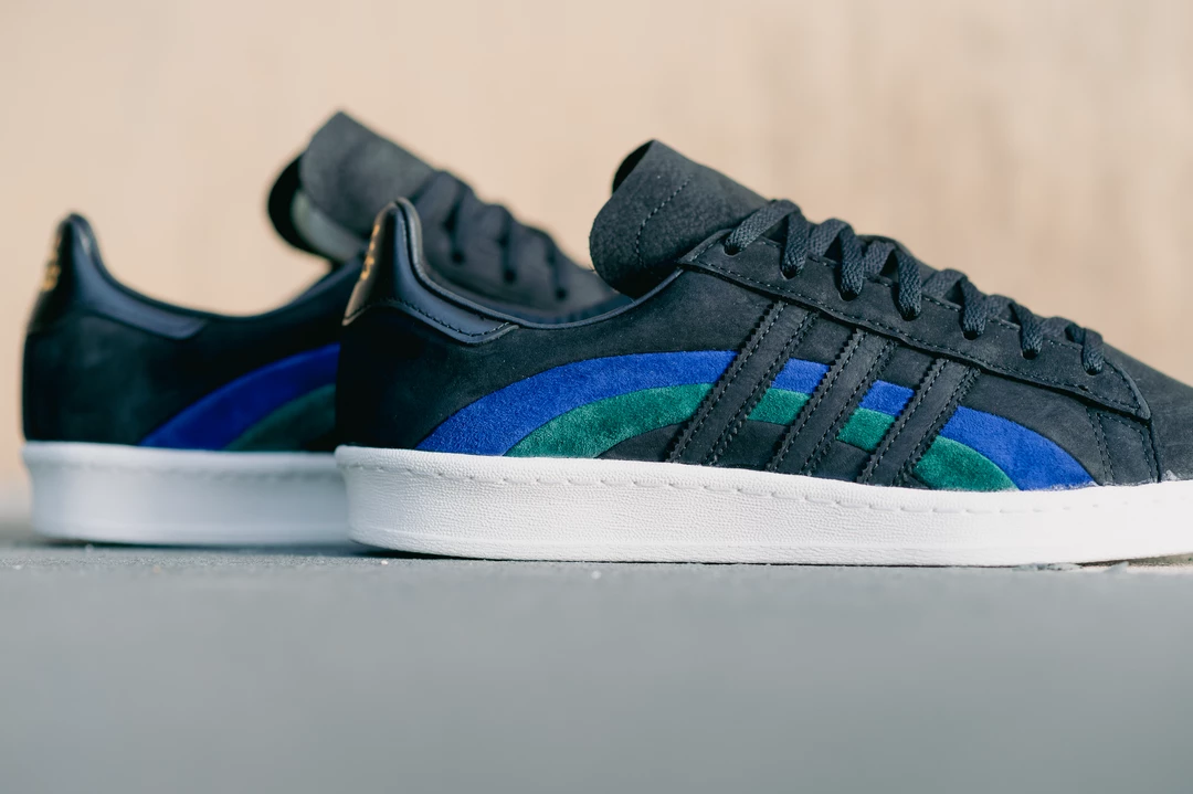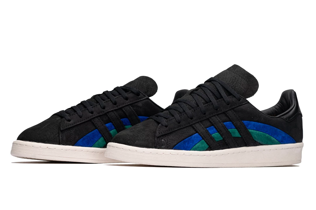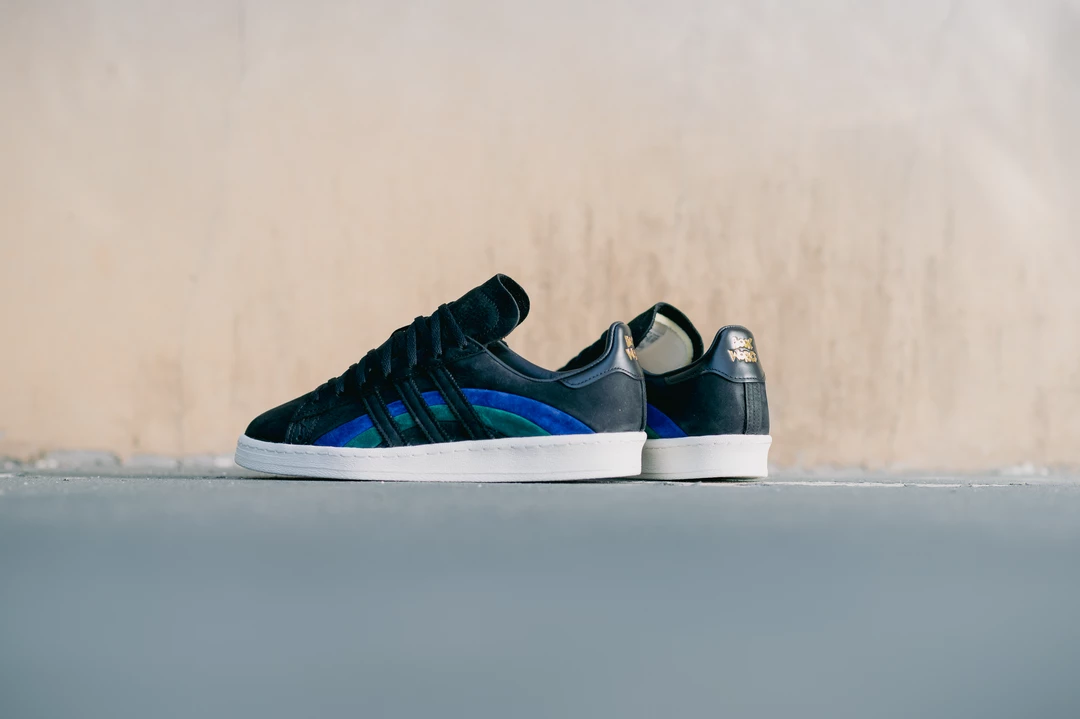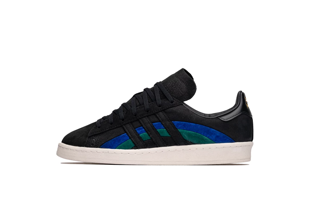 As a homage to the original Campus silhouette in the 70s, Adidas Originals and jazz label Book Works have collided to release the Campus 80. The architecture of the profile features the classic three stripes dressed in black, intertwining with the Bold Blue and Collegiate Green colorway. The sneaker is completed with gold-tinted branding along the rear and insole and Book Works branding on the heel.