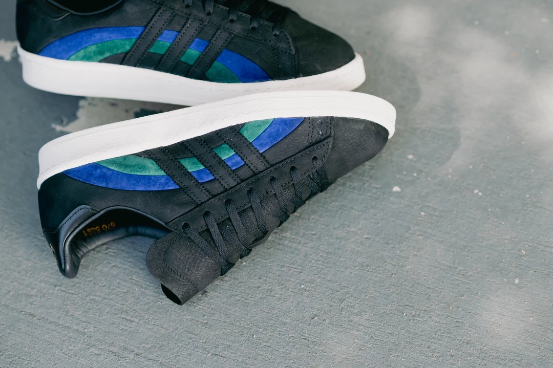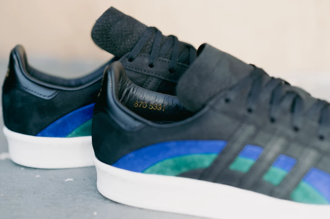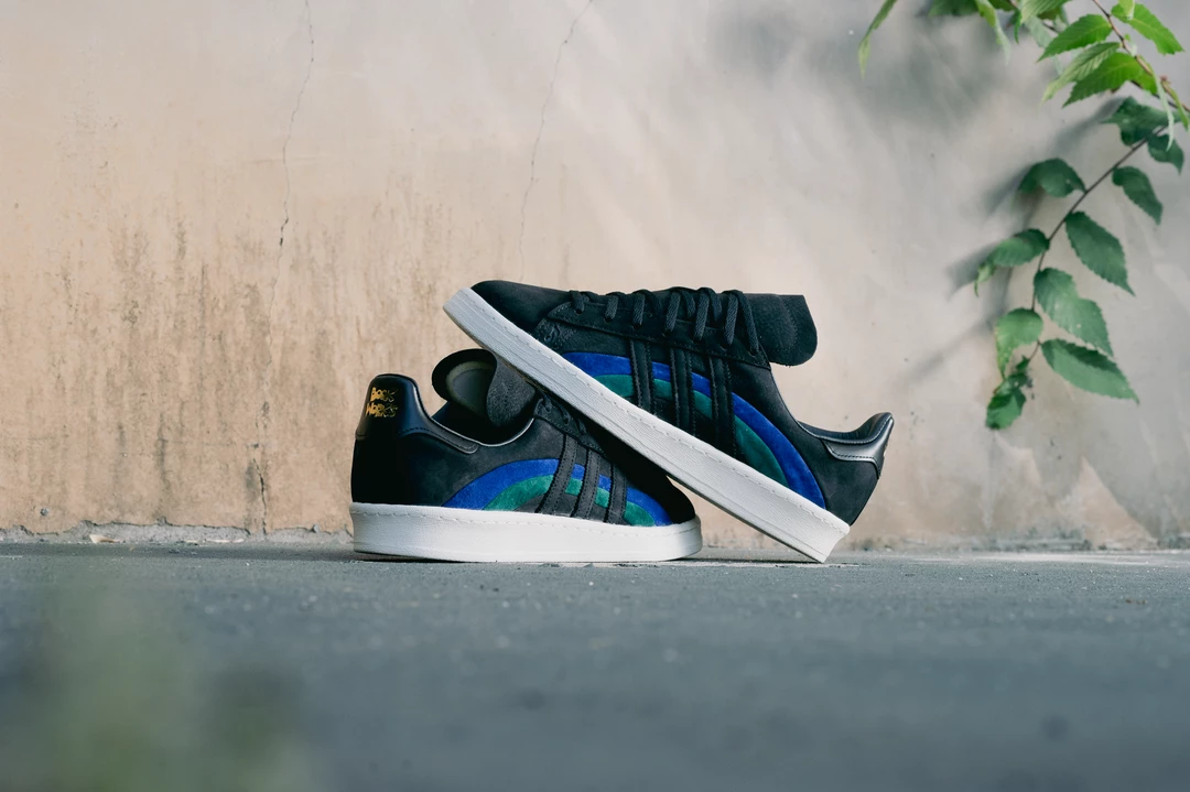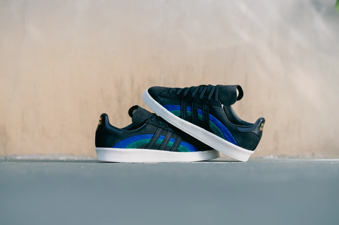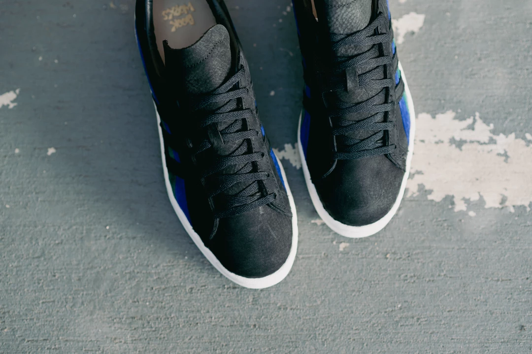 As a homage to the original Campus silhouette in the 70s, Adidas Originals and jazz label Book Works have collided to release the Campus 80. The architecture of the profile features the classic three stripes dressed in black, intertwining with the Bold Blue and Collegiate Green colorway. The sneaker is completed with gold-tinted branding along the rear and insole and Book Works branding on the heel.