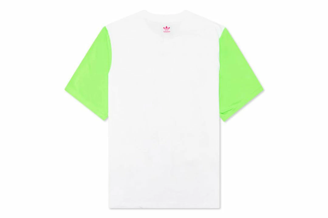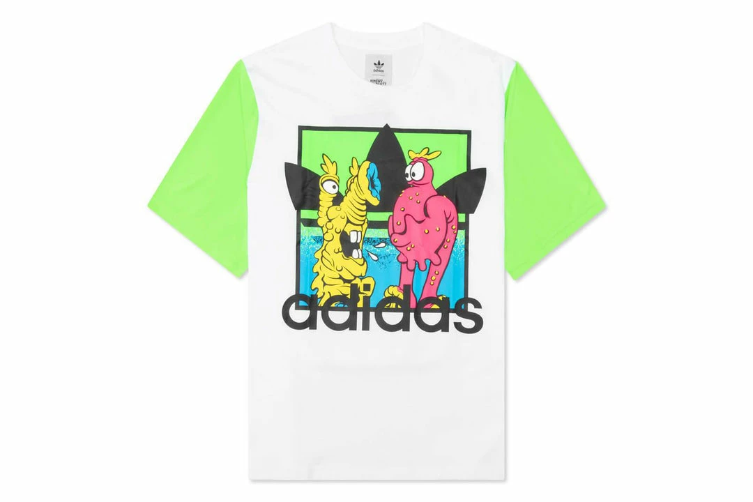 An Adidas logo stands out against Jeremy Scott’s iconic artwork, a playful representation of the collaboration. Contrast neon sleeves take the look to the next level.
