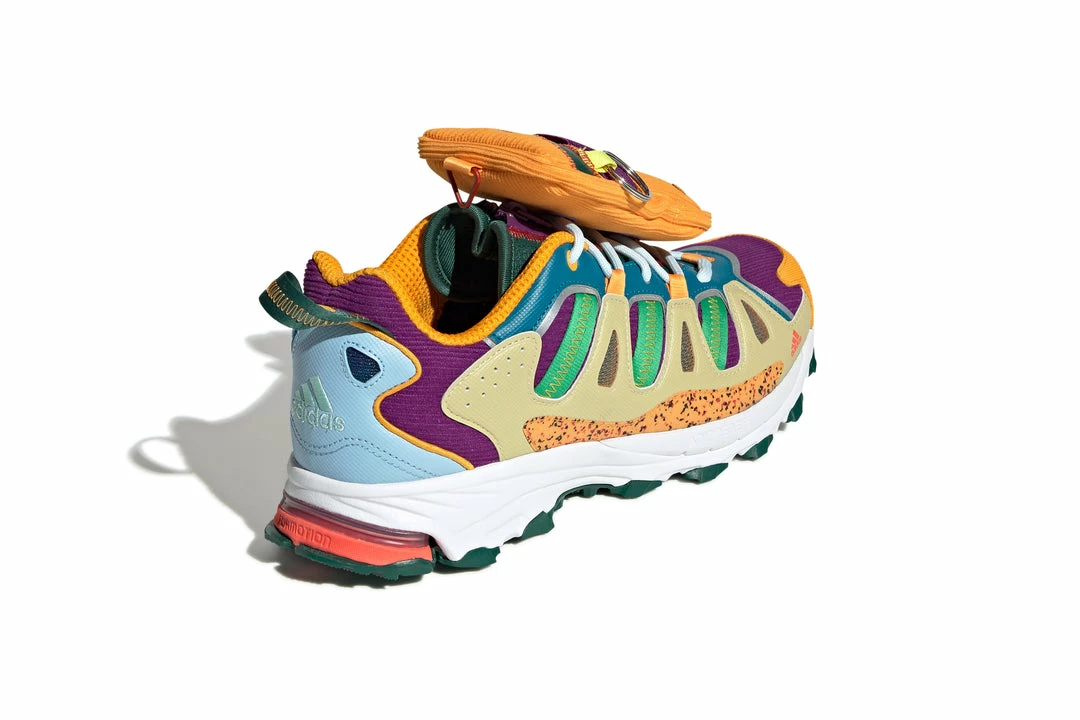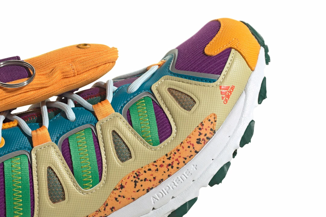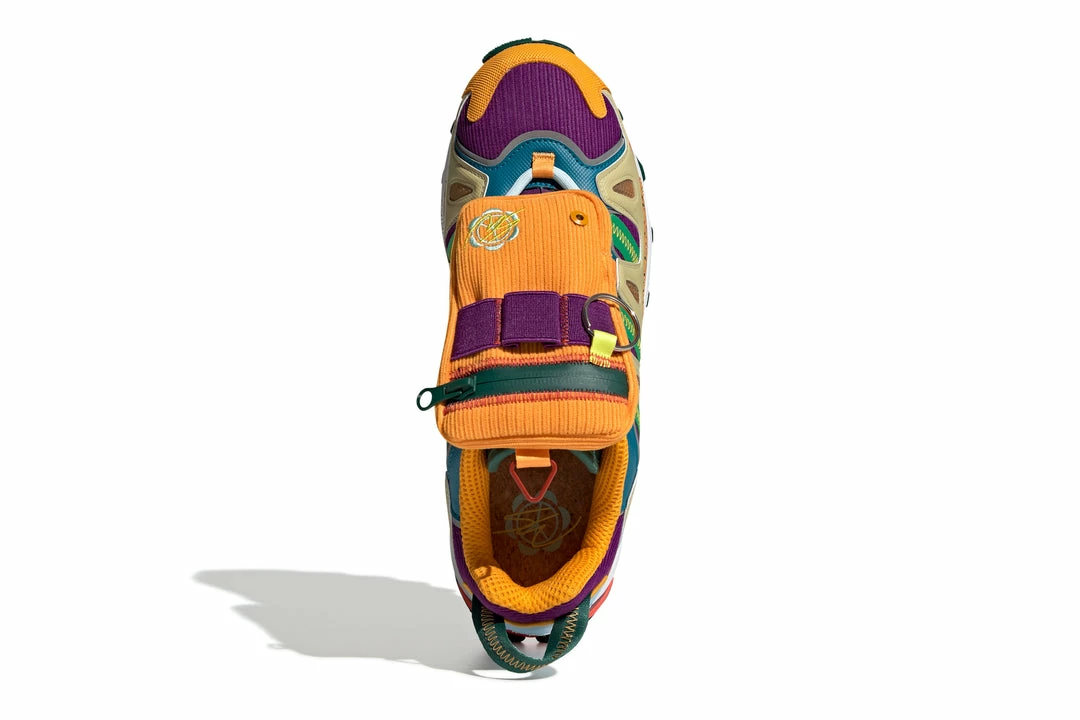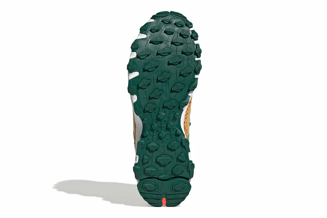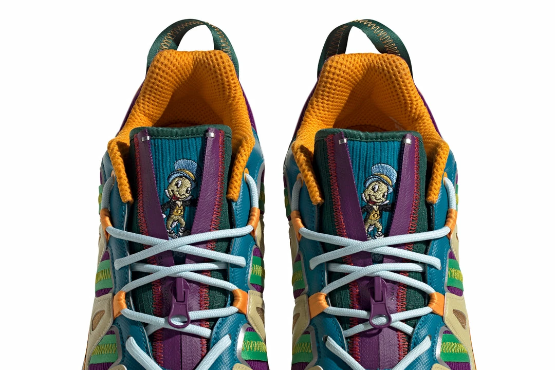 Famous sneakerhead Sean Wotherspoon and Adidas Originals as well as Disney collide to create the Superturf Adventure seen in Mesa/Halo Amber. With the ultimate adventure aesthetic, the pair are also made up of recycled materials and vegan alternatives. The upper base is constructed of corduroy overlaid with green and yellow stripes. The blue eyestay placket is secured along the upper of the silhouette. The most distinct feature of the sneakers is the zipper-equipped tongue, which when opened features an embroidered Jiminy Cricket from Disney’s Pinocchio. The sneakers are complete with a heel clip and Adidas branding.