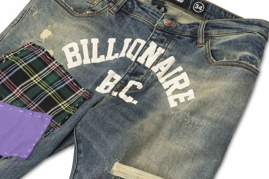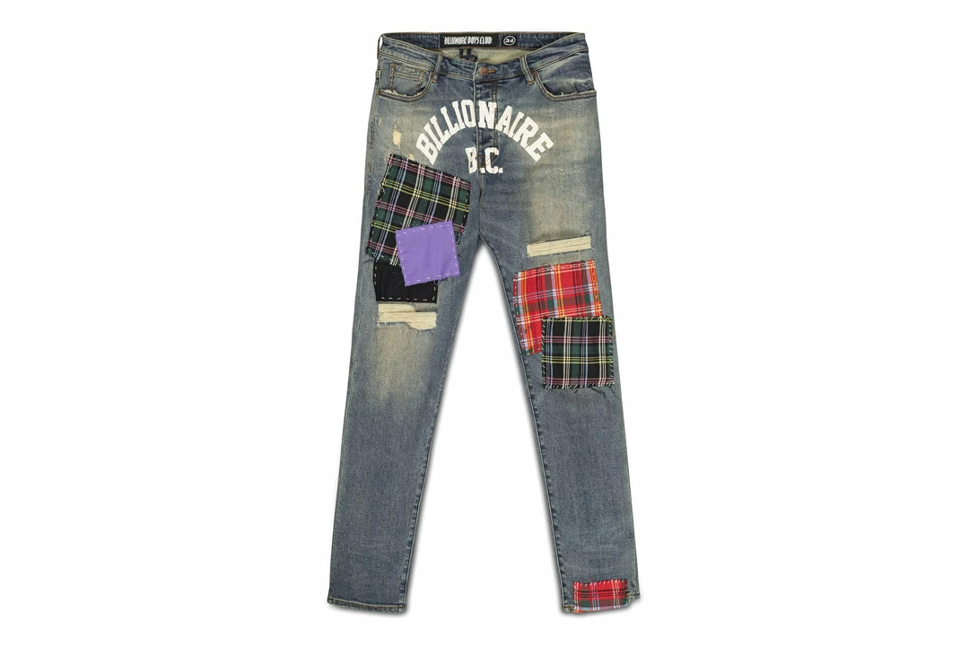 - Plaid patchwork & tonal embroidered front crotch & back pocket