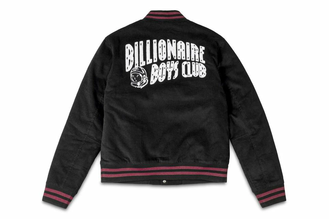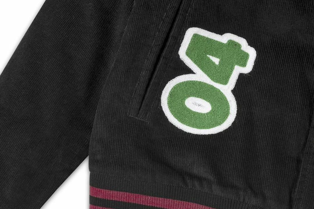 - Varsity jacket printed sleeves w/ chenille patchwork striped rib detailing