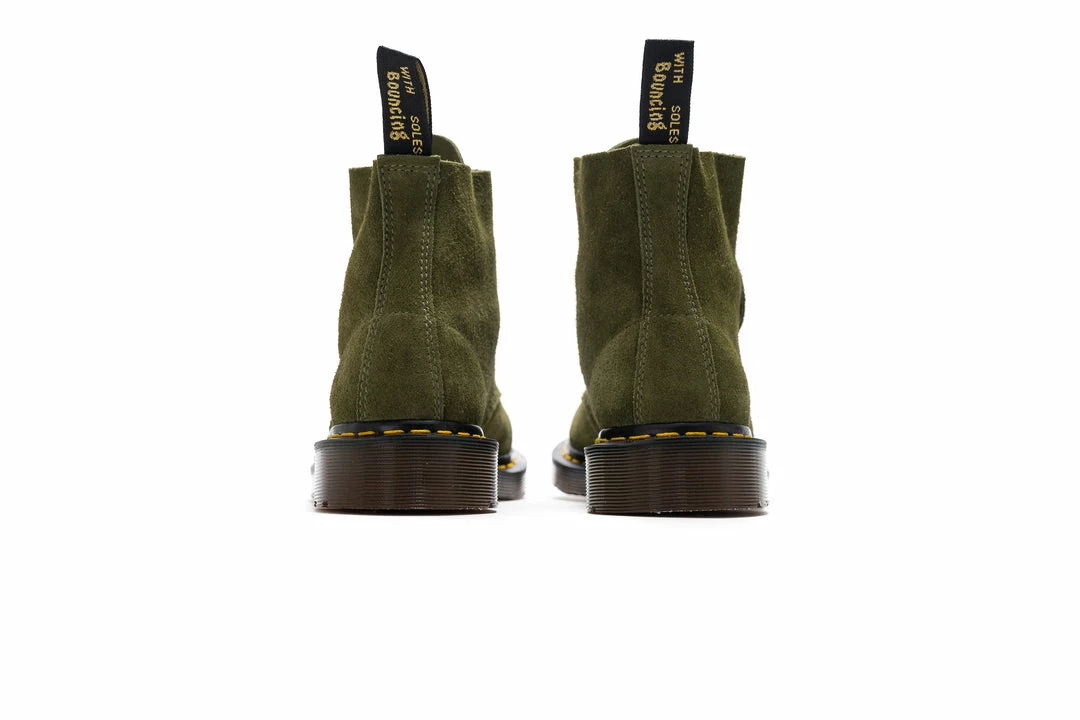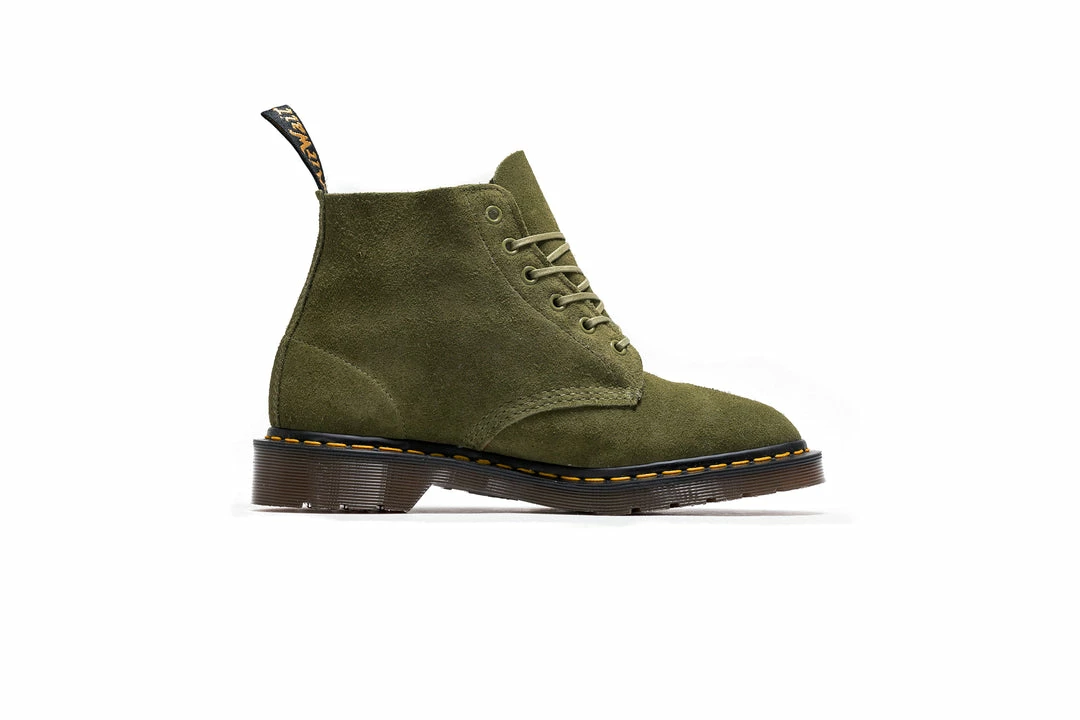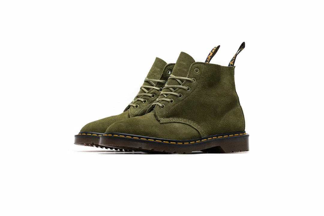 Last year’s C. F. Stead suede collection went down a storm. Dr. Martens has updated it for the new season with our signature 6-eye boot: the 101. Leeds-based tannery C. F. Stead are renowned for producing some of the finest leathers around. And this Desert Oasis suede is no exception. A soft, oiled suede, it has a rugged nap and textured finish. Handcrafted in our original factory, these boots are set a tapered last and sit on a classic DMs sole. Fitted with tonal flat laces, they’re marked with our signature yellow stitching and a black and gold heel loop.