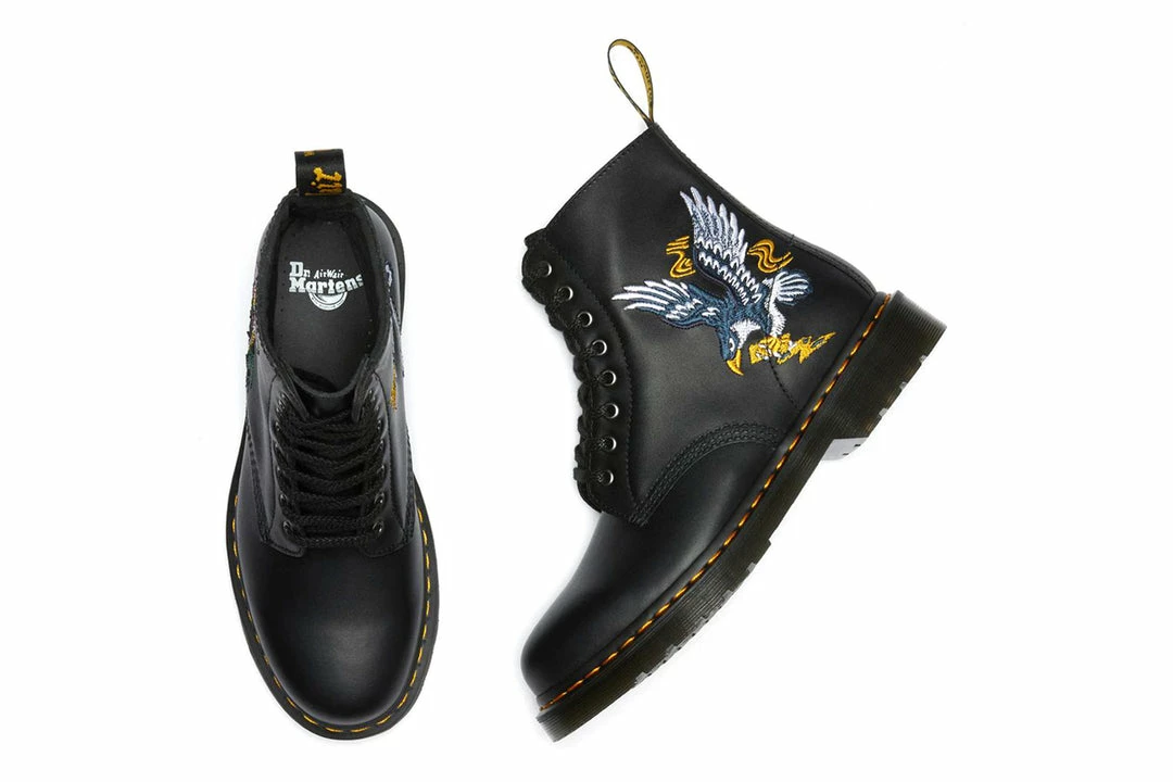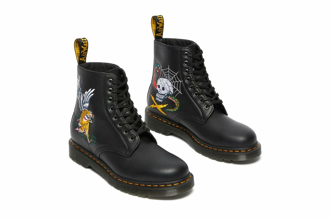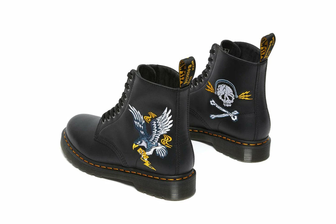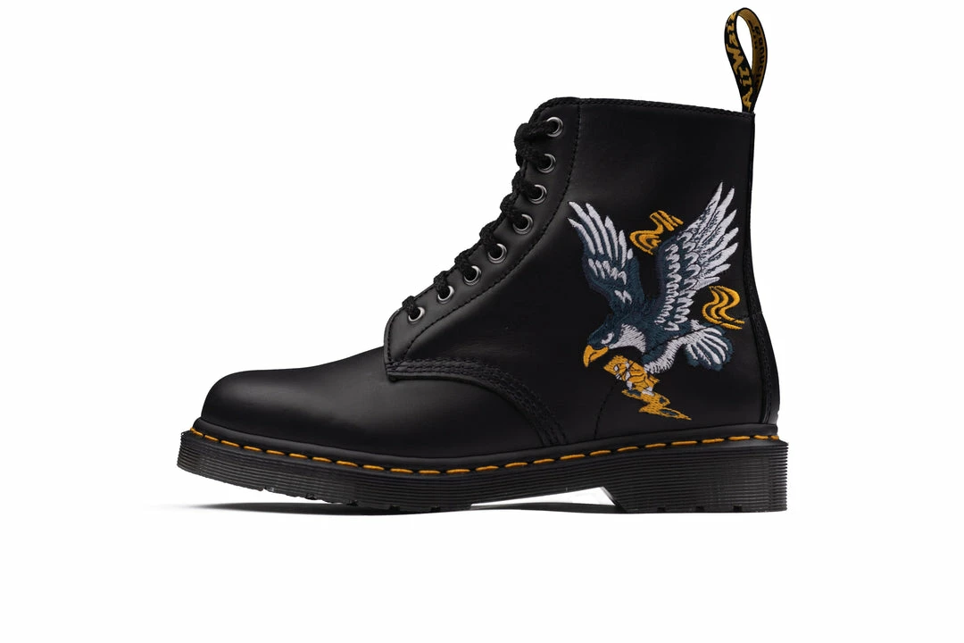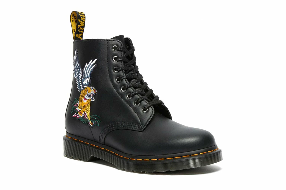 These new boots take cues from Japanese souvenir (Sukajan) jackets, popular with dissident Japaneseyouths in the 40s and 50s. Back then, the DIY jackets were embroidered with illustrations, graphics and markings that meant something to the wearer. And this pair is no different. Detailed with winged tiger and skull designs, they’re built from black Nappa leather and marked with our signature yellow welt stitching and scripted AirWair heel loop.
