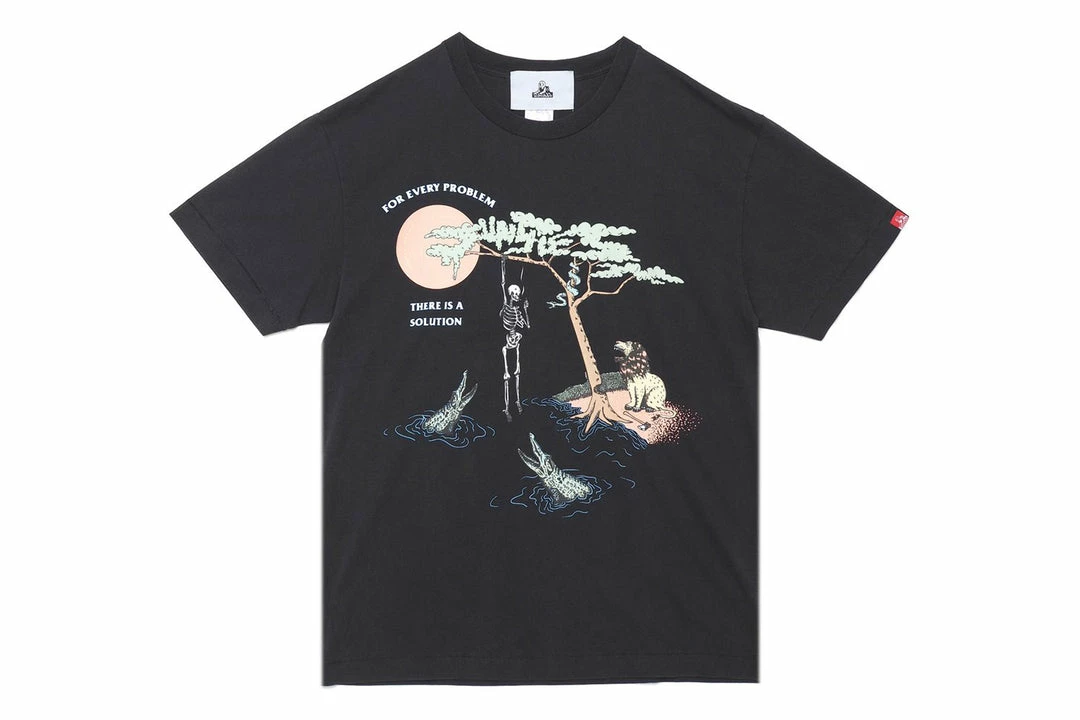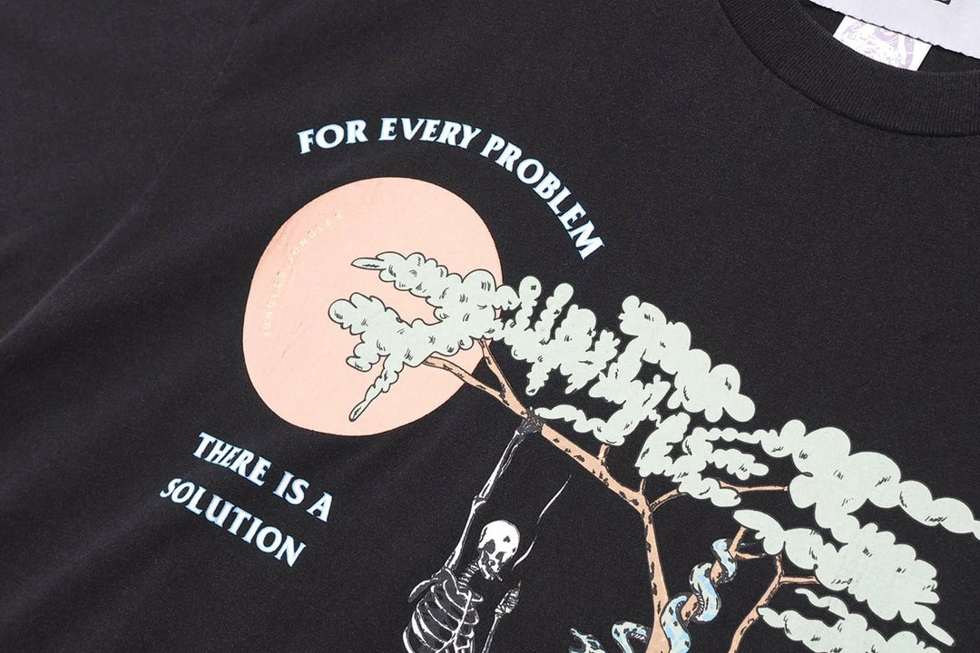 For every problem, there is a solution. The artwork depicts a skeleton in a problematic situation there may not be a solution to.