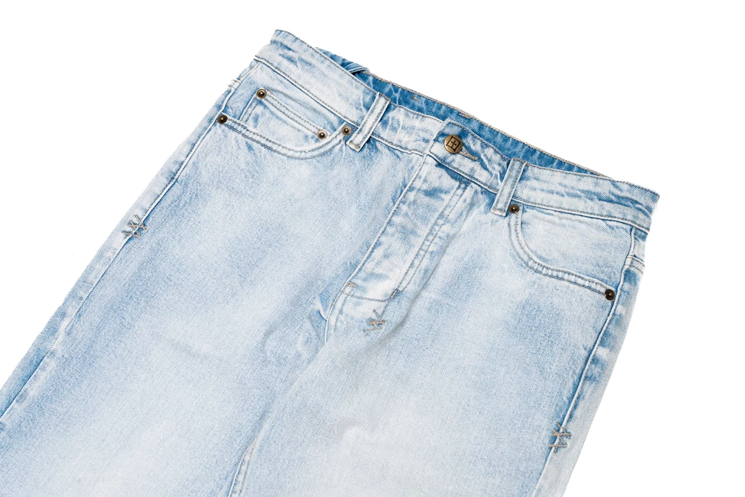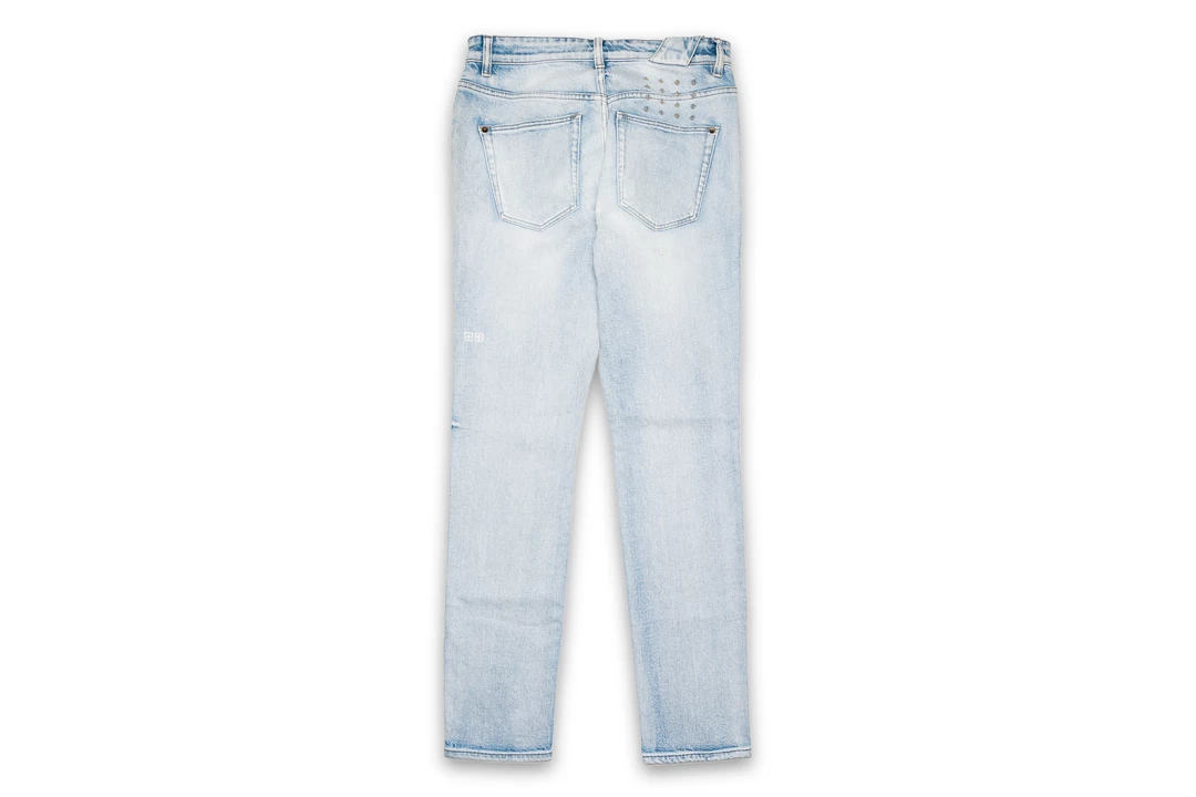 The Chitch Washed Out is slim fit denim jean with a High rise. Made from a heavy duty premium stretch cotton denim from Turkey in a washed blue colourway with Ksubi trashing and repair patches. This style features signature Ksubi branding and removable pocket tag.
