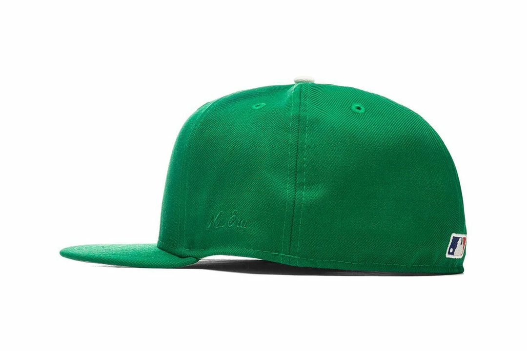 The Kelly Green Fear of God Essential 59FIFTY Fitted Cap features a Fear of God logo at the front panels, a Gray undervisor and the Official MLB Batterman logo at the rear.
