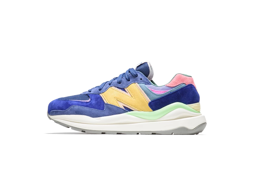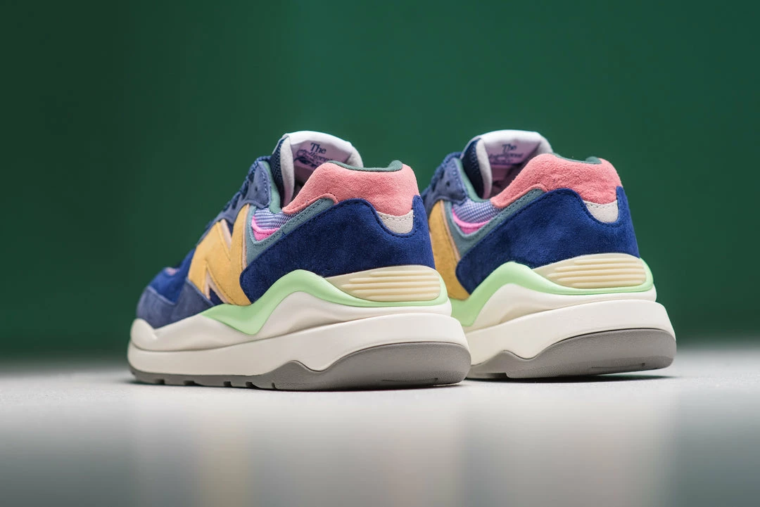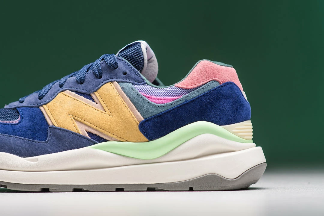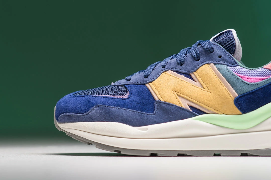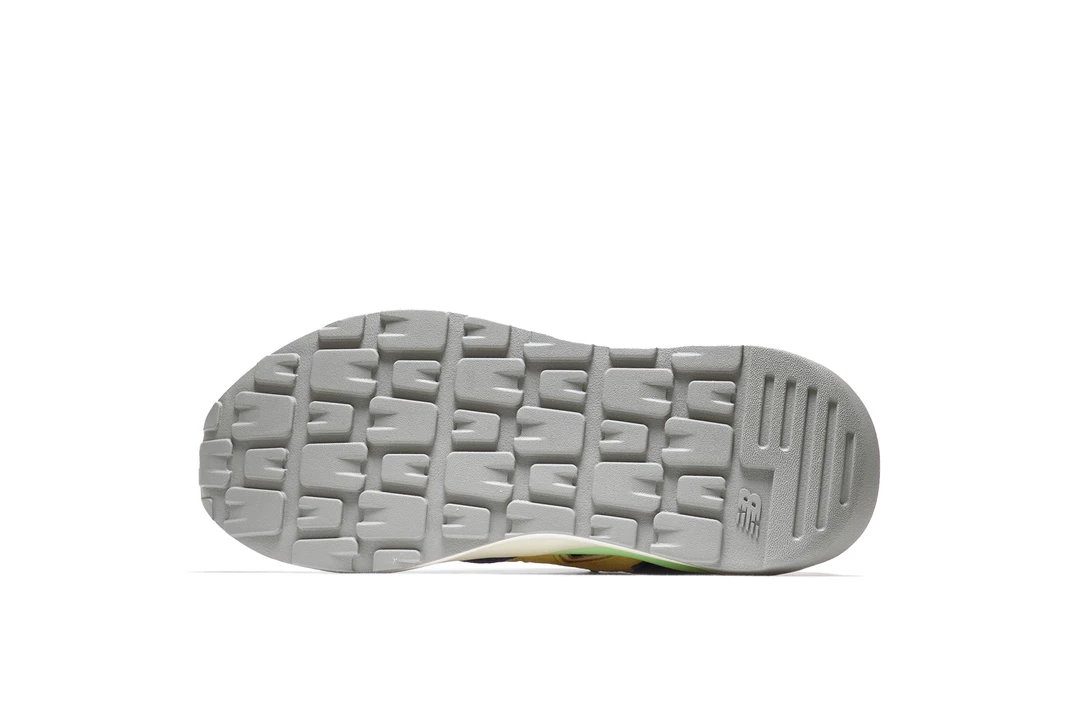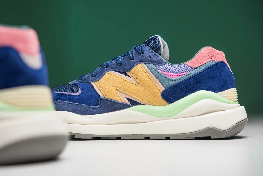 The 57/40 is the answer to a question that is simple, yet astronomical in scale. What if we updated the most New Balance shoe of all time – the 574? Despite its legacy of unassuming, almost effortless versatility, the original 574 was a unique design for its era, a hybrid road/trail design that didn’t lean on visible technical features. The 57/40 approaches the hybrid concept with a few extra years’ worth of design developments to explore, and creates a new perspective on an iconic design. An overall sleeker silhouette provided by a slimmer last combines with a range of exaggerated features. The unique midsole combines a flared take on the classic 574 construction with ‘90s tech inspired details, while the mudguard and eyerow feature the distinctive wavy embellishments of the ‘80s.
