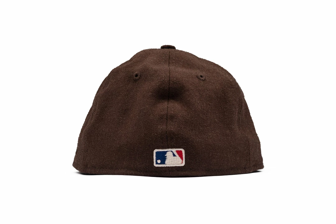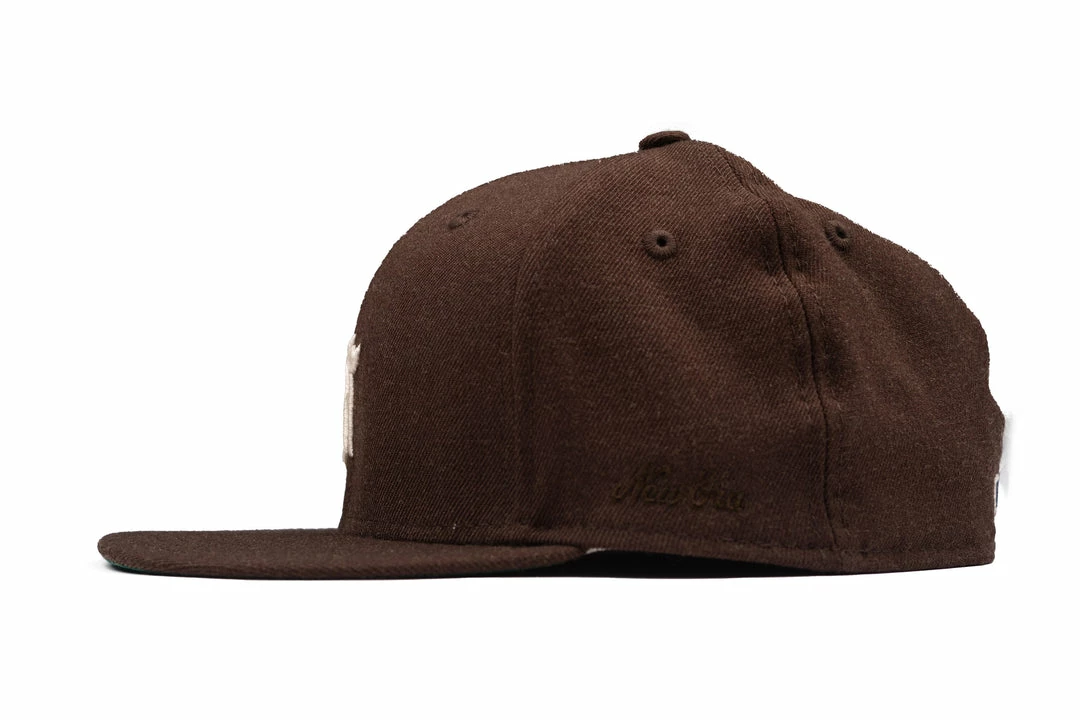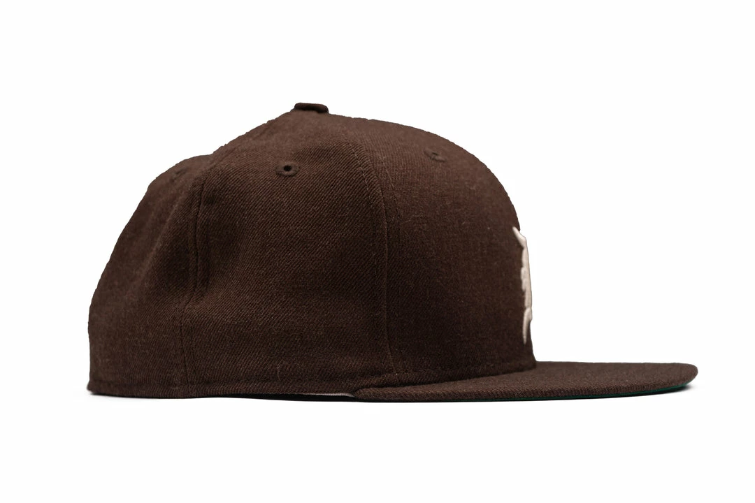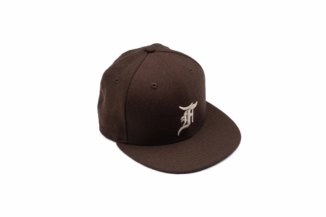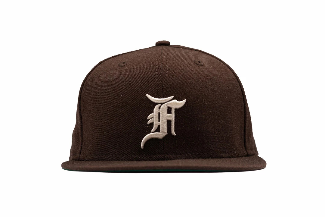 The Walnut Fear of God Essential 59FIFTY Fitted Cap features a Fear of God logo at the front panels, a Kelly Green undervisor and the Official MLB Batterman logo at the rear.