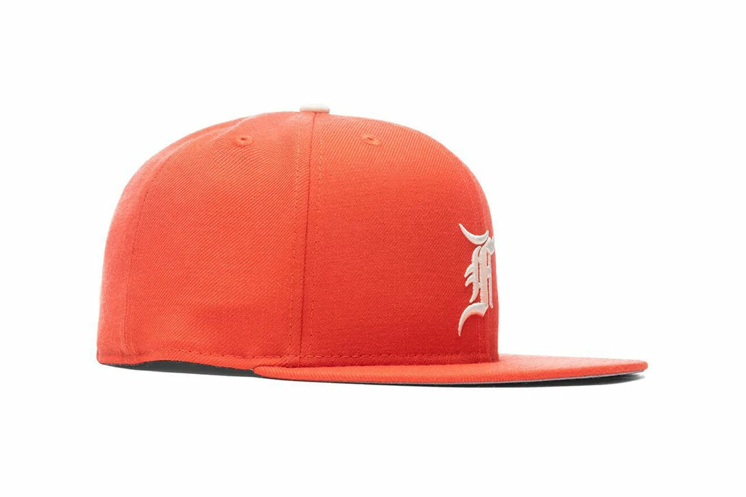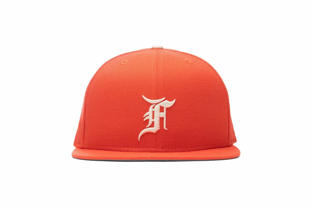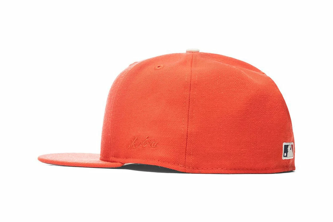 The Orange Fear of God Essential 59FIFTY Fitted Cap features a Fear of God logo at the front panels, a Gray undervisor and the Official MLB Batterman logo at the rear.