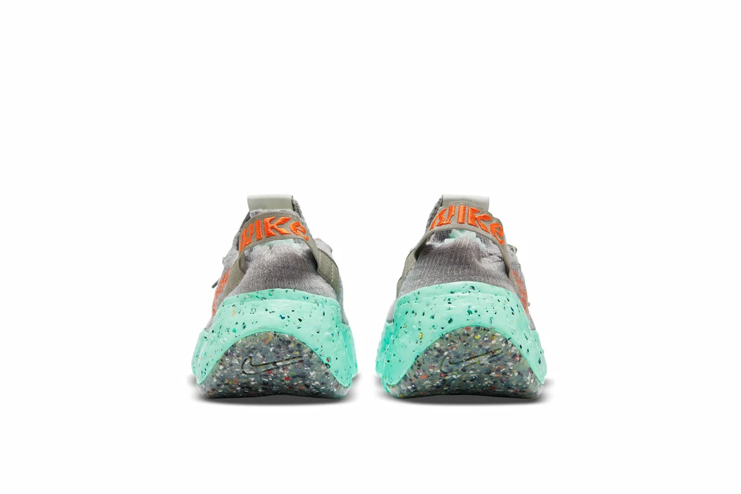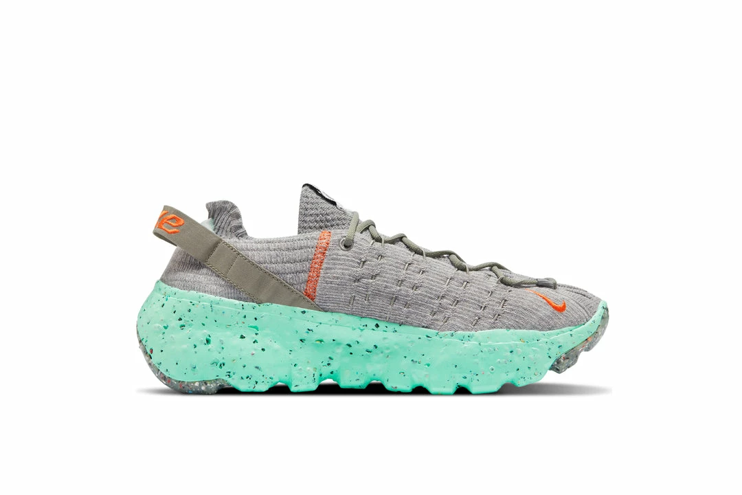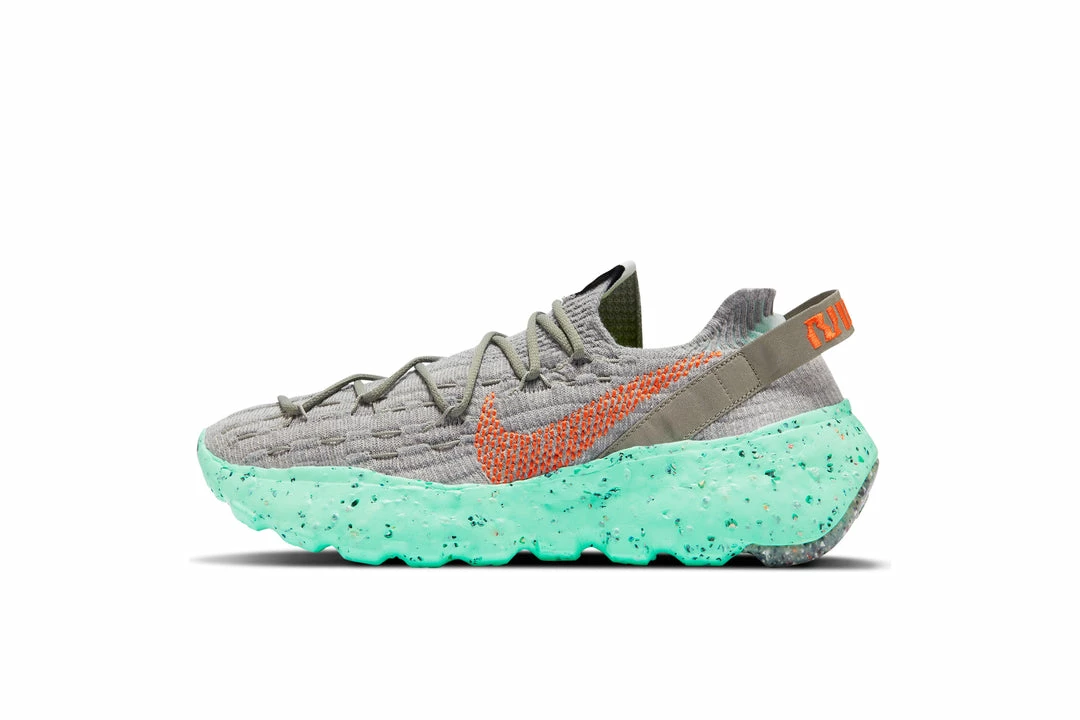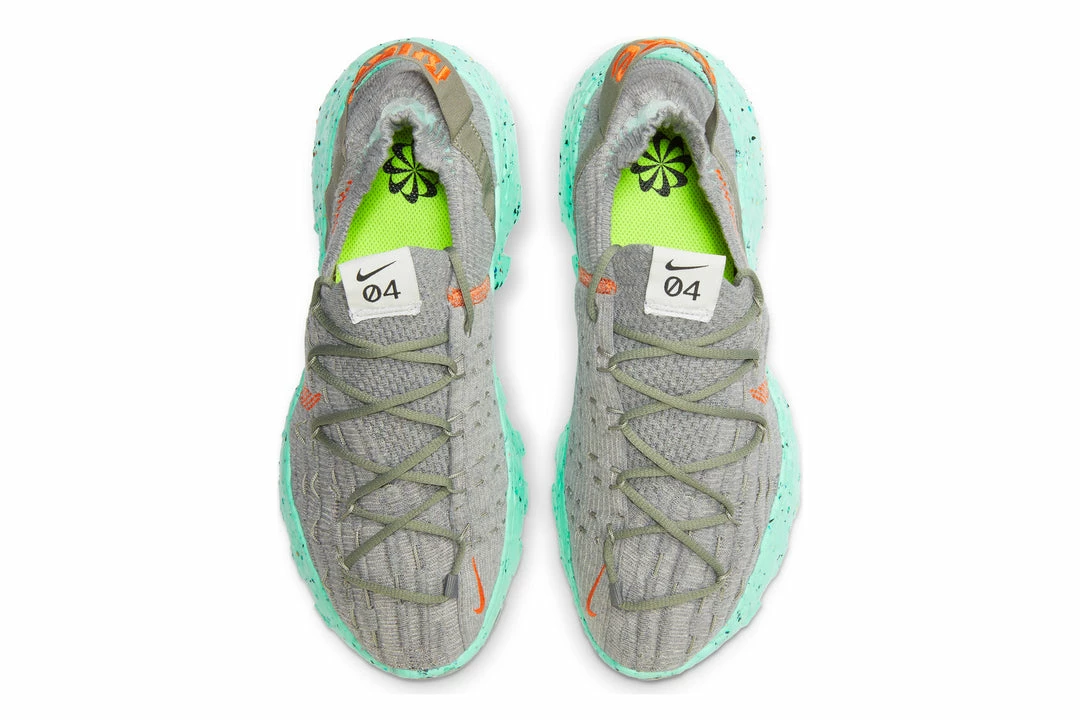 Space Hippie is a story of trash transformed. From the upper to the outsole, Space Hippie 04 is made of at least 25% recycled material by weight. Not only is it the most lightweight silhouette within the collection, it also has the lowest carbon footprint. Its ‘Space Waste Yarn’ upper includes about 75% recycled content by weight–made from recycled plastic bottles, t-shirts and yarn scraps. A soft, Crater Foam midsole combines Nike grind with a blend of foams for stability and a unique aesthetic.