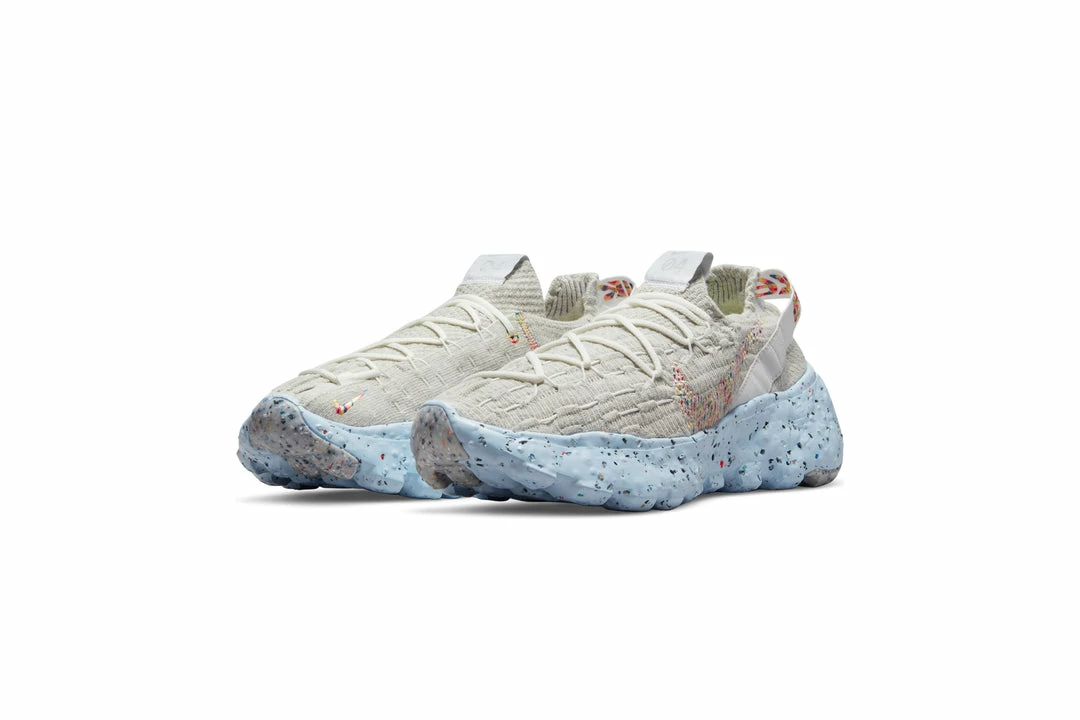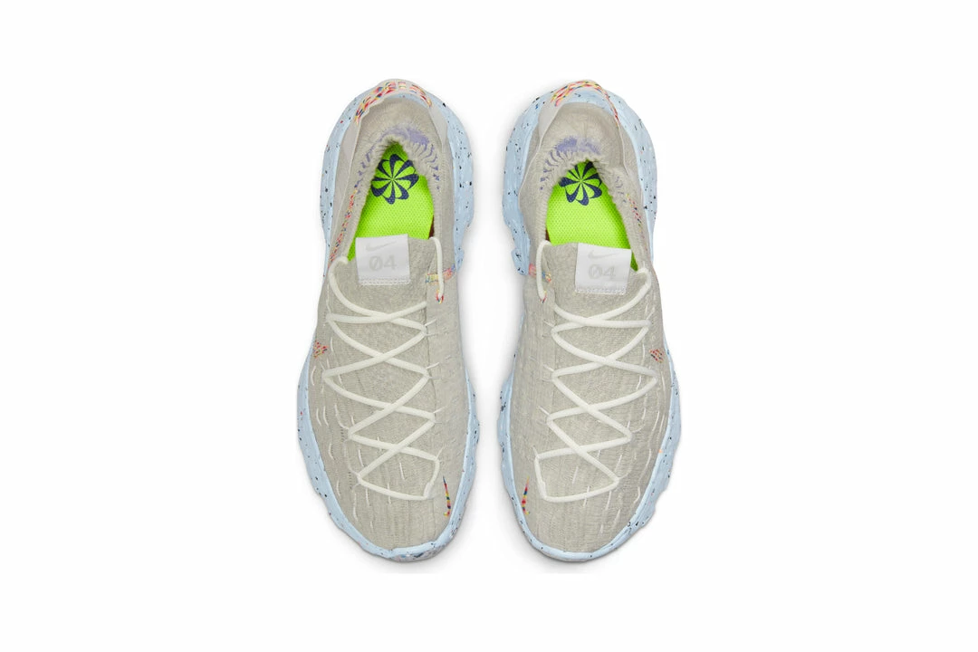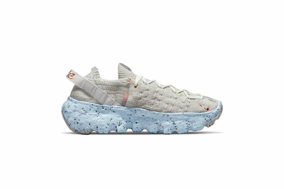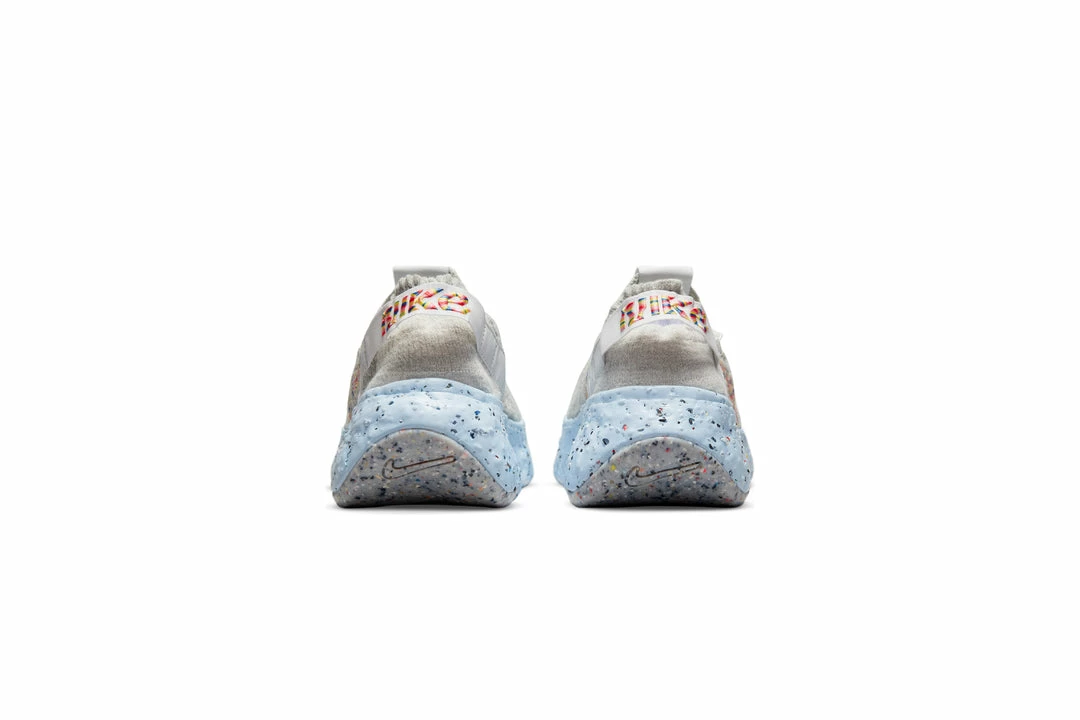 Space Hippie is a story of trash transformed. From the upper to the outsole, Space Hippie 04 is made of at least 25% recycled material by weight. Not only is it the most lightweight silhouette within the collection, it also has the lowest carbon footprint. Its ‘Space Waste Yarn’ upper includes about 75% recycled content by weight–made from recycled plastic bottles, t-shirts and yarn scraps. A soft, Crater Foam midsole combines Nike grind with a blend of foams for stability and a unique aesthetic.