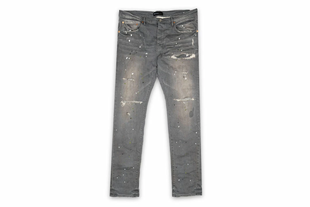 These grey jeans are treated with a distinctive wash for a vintage, one-of-a-kind effect. Abrasions, knee blowouts, and repairs are done by hand. All jeans are finished individually by hand, so no two pieces are the same.
