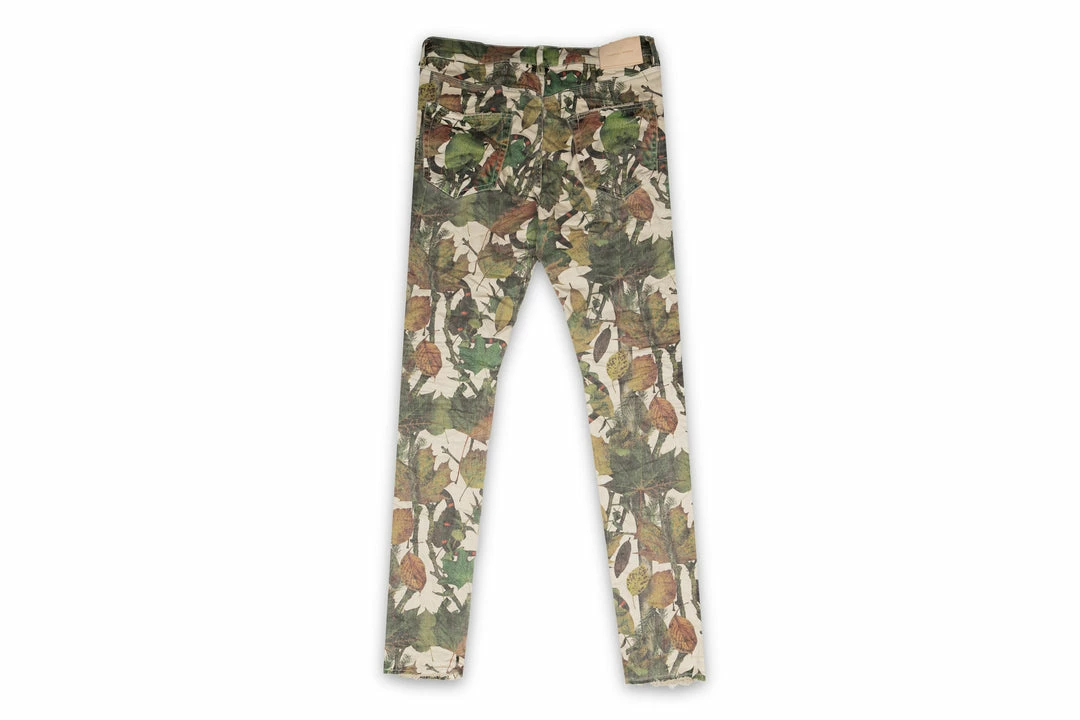 This denim fabric is printed with a custom camo pattern, and washed down for a vintage feel. Abrasions are done by hand. All jeans are finished individually by hand, so no two pieces are the same.