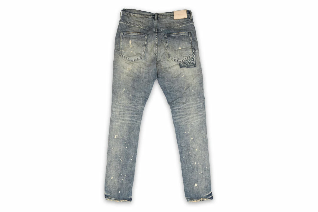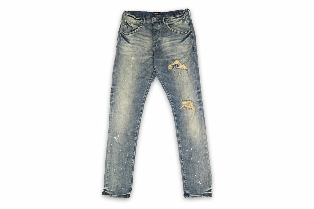These raw hem jeans are cut from indigo denim, treated with a distinctive vintage wash for a one-of-a-kind effect. The repairs feature bandana fabric. Blowout and abrasions are done by hand. All jeans are finished individually by hand, so no two pieces are the same.