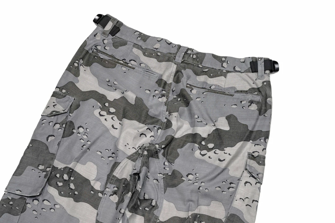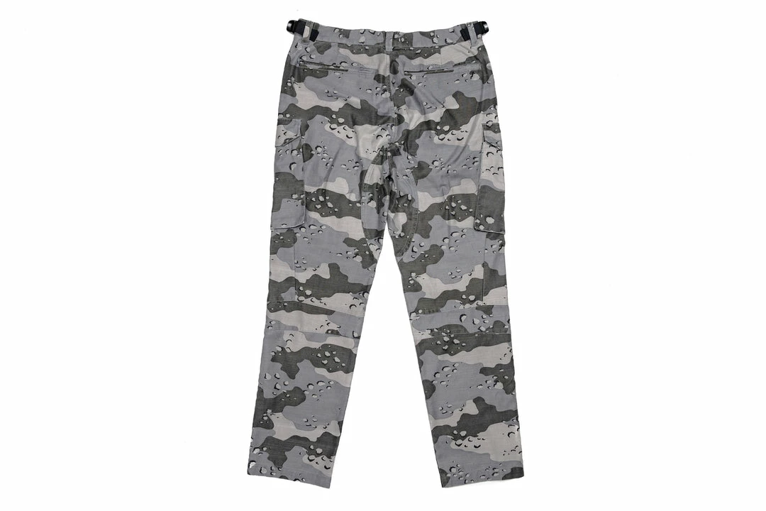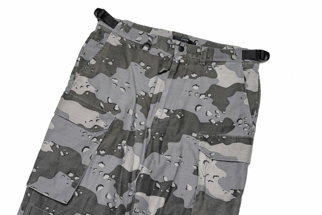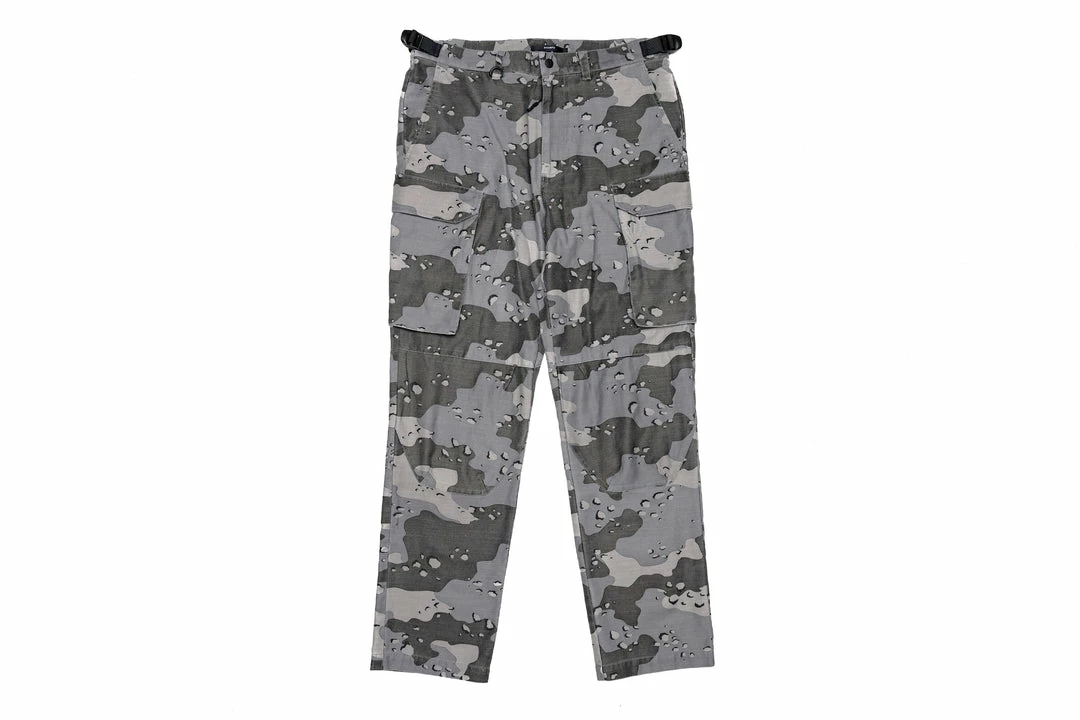 - Comes in contrast camo fabrication with eight various cargo pockets with side zipper entries, pocket flaps, and tonal snaps throughout the pant.