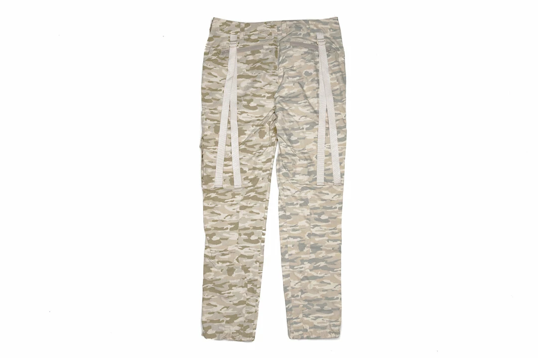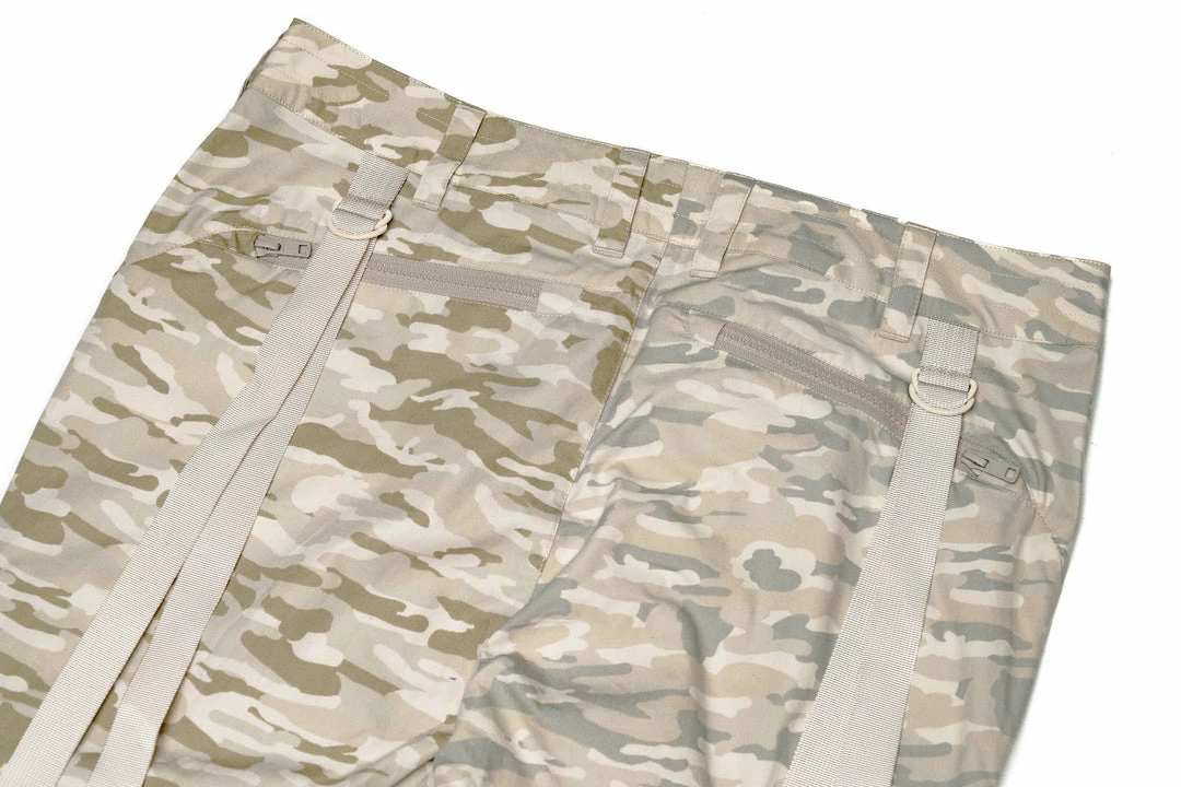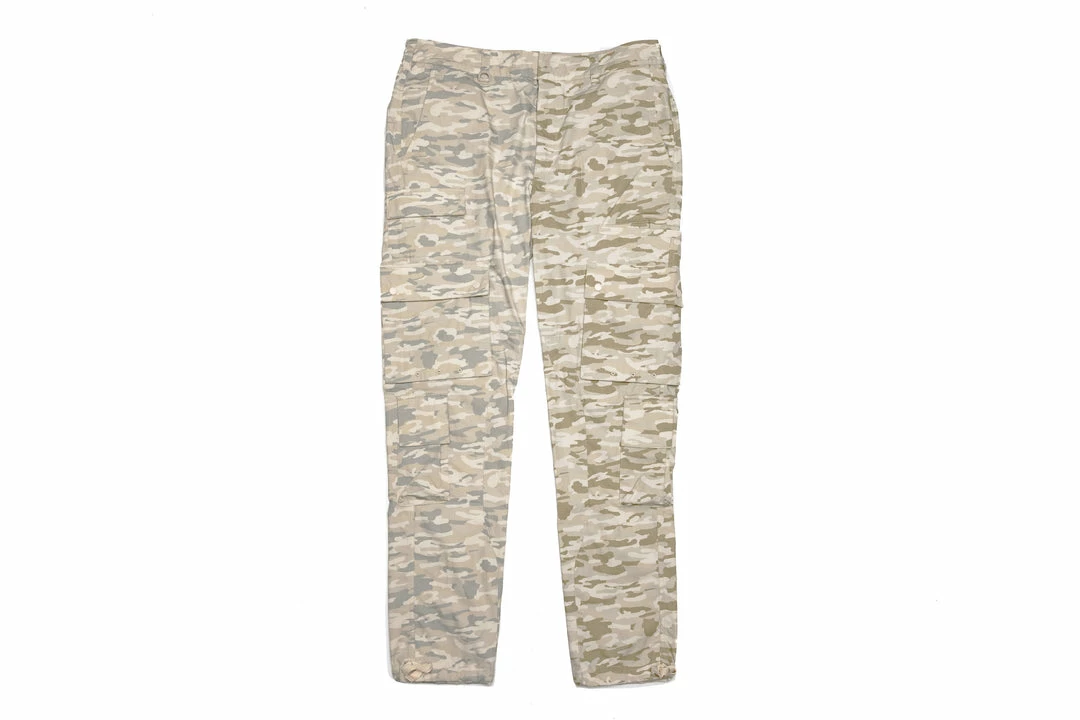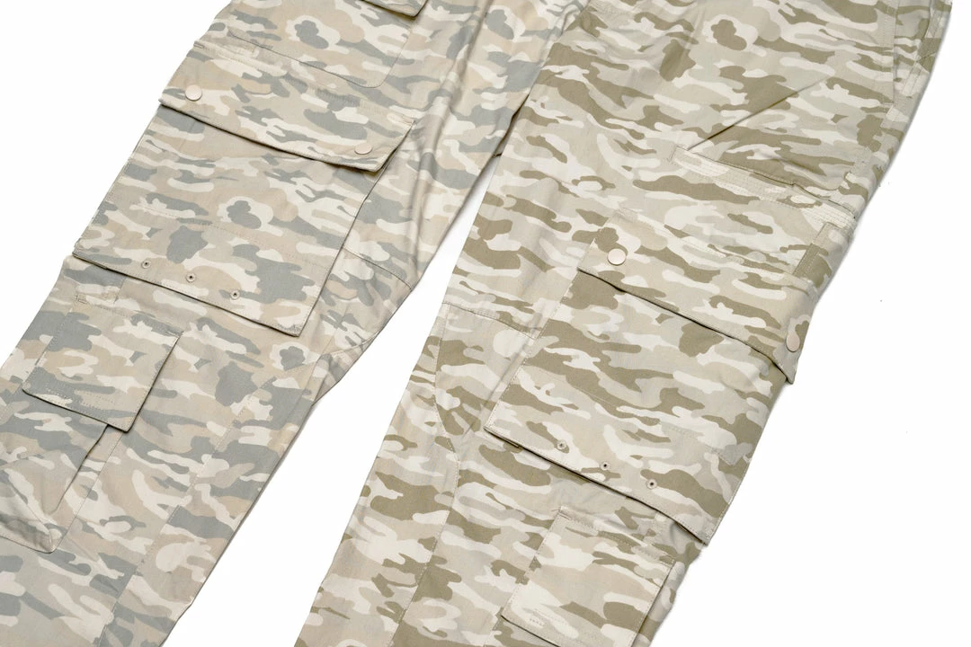 - Comes in contrast camo fabrication with eight various cargo pockets with side zipper entries, pocket flaps, and tonal snaps throughout the pant.