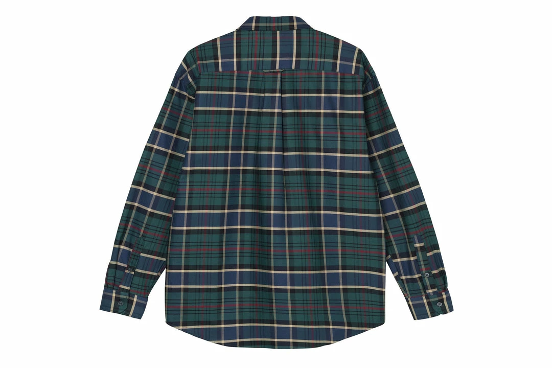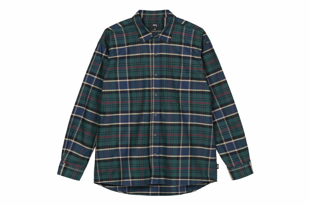 Classic oxford shirt with tonal Stüssy logo embroidery. Dual chest pockets, shiny melamine buttons, and single button cuffs. Finished with flat hem and Stüssy stock flag label at side seam.