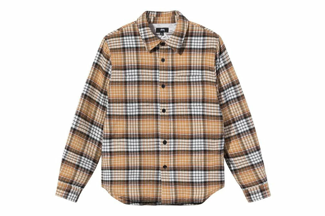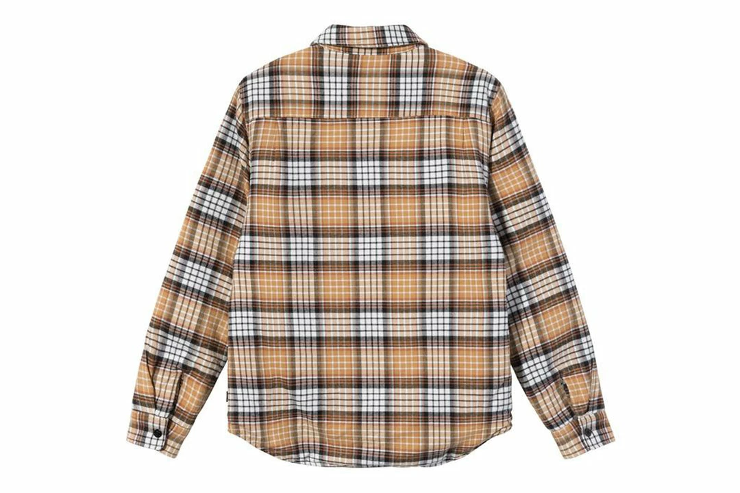 Quilted plaid shirt with silver satin lining. Dual chest pockets, shiny melamine buttons, and single button cuffs. Finished with curved hem and Stüssy stock flag label at side seam.