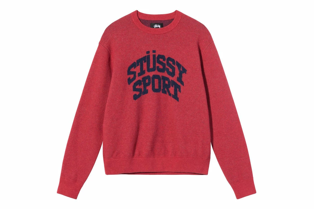 Brushed knit sweater with jacquard Stüssy Sport logo. Set-in sleeves and heavy gauge rib collar, cuffs, and waist hem. Finished with Stüssy flag label at side seam.