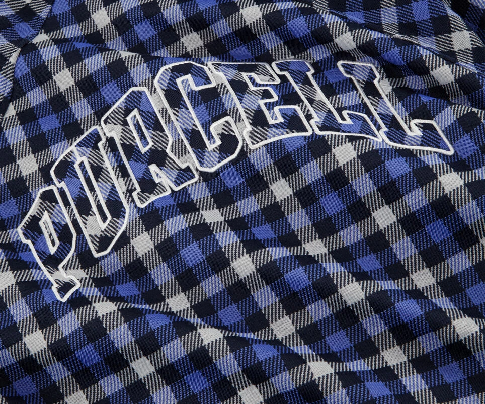 - Tattersall “Purcell” applique lettering across back, woven Racquet Club label on left hip, and felt “Snyder” label on interior neck seam.