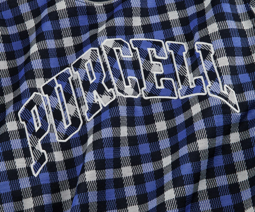 - Applique “Purcell” lettering across chest and woven collection branding on hip.