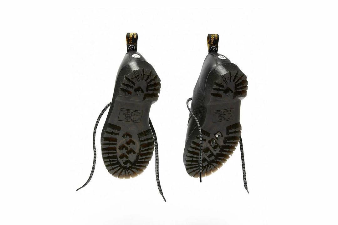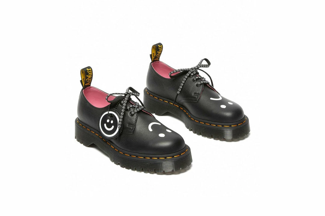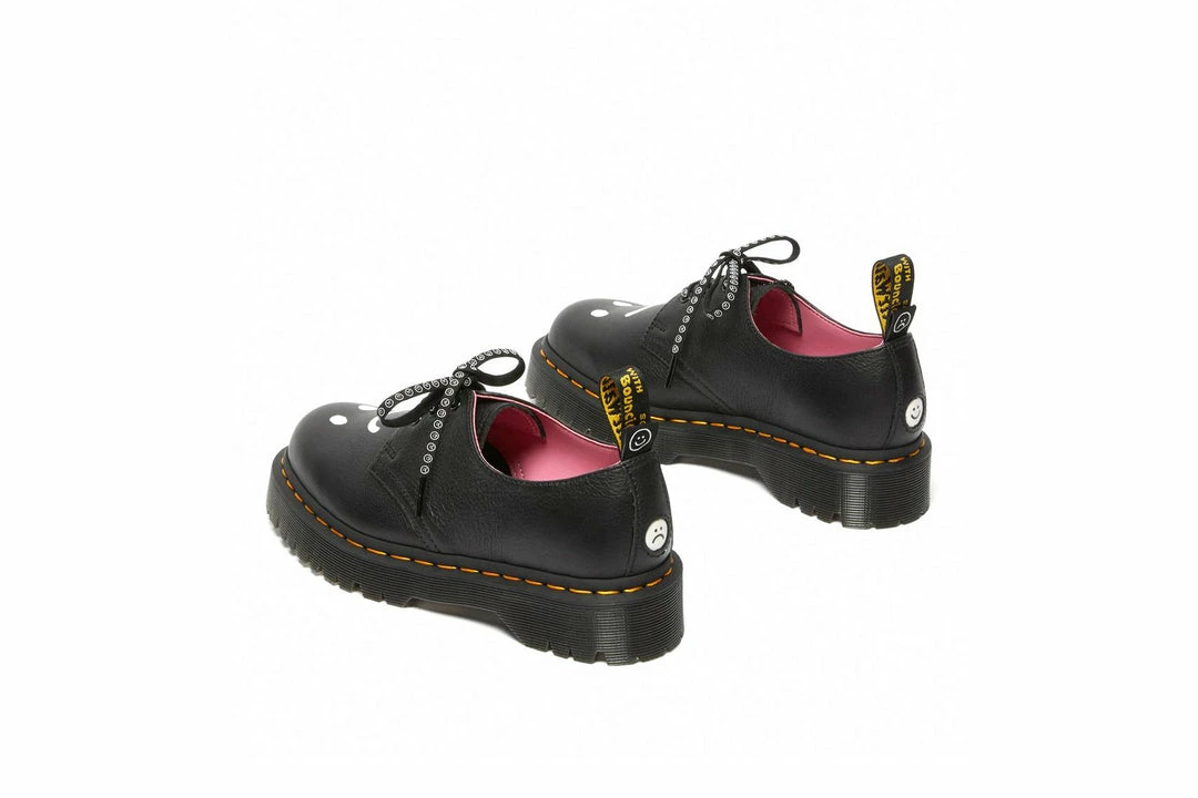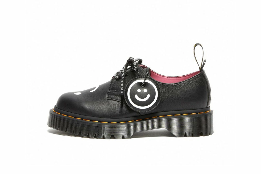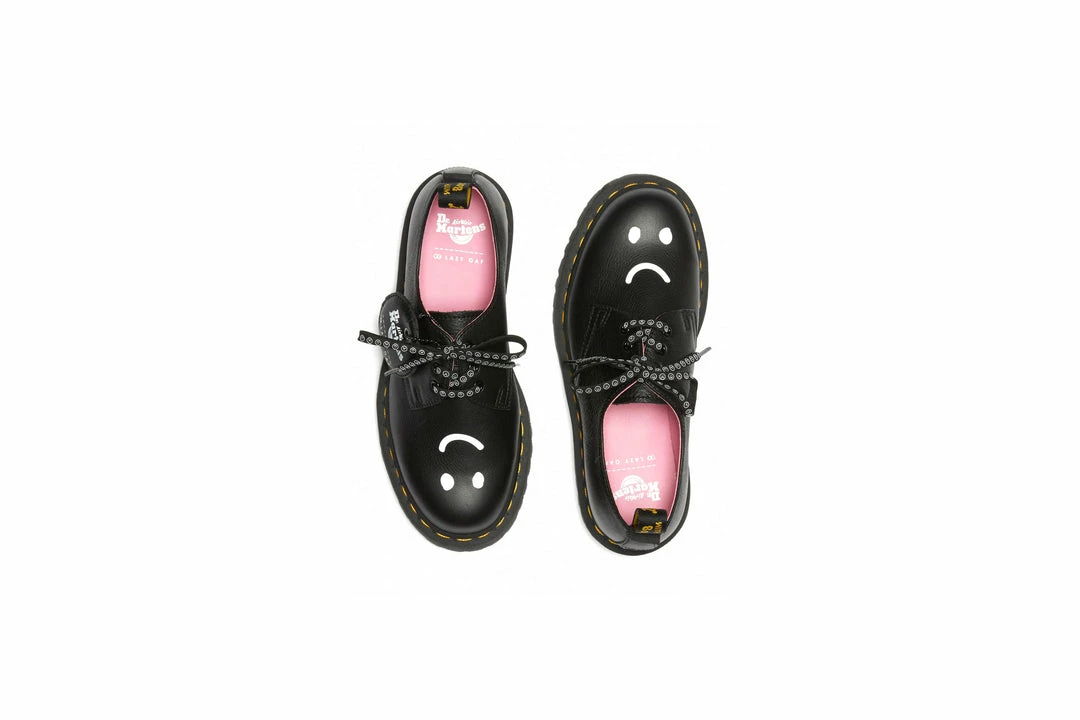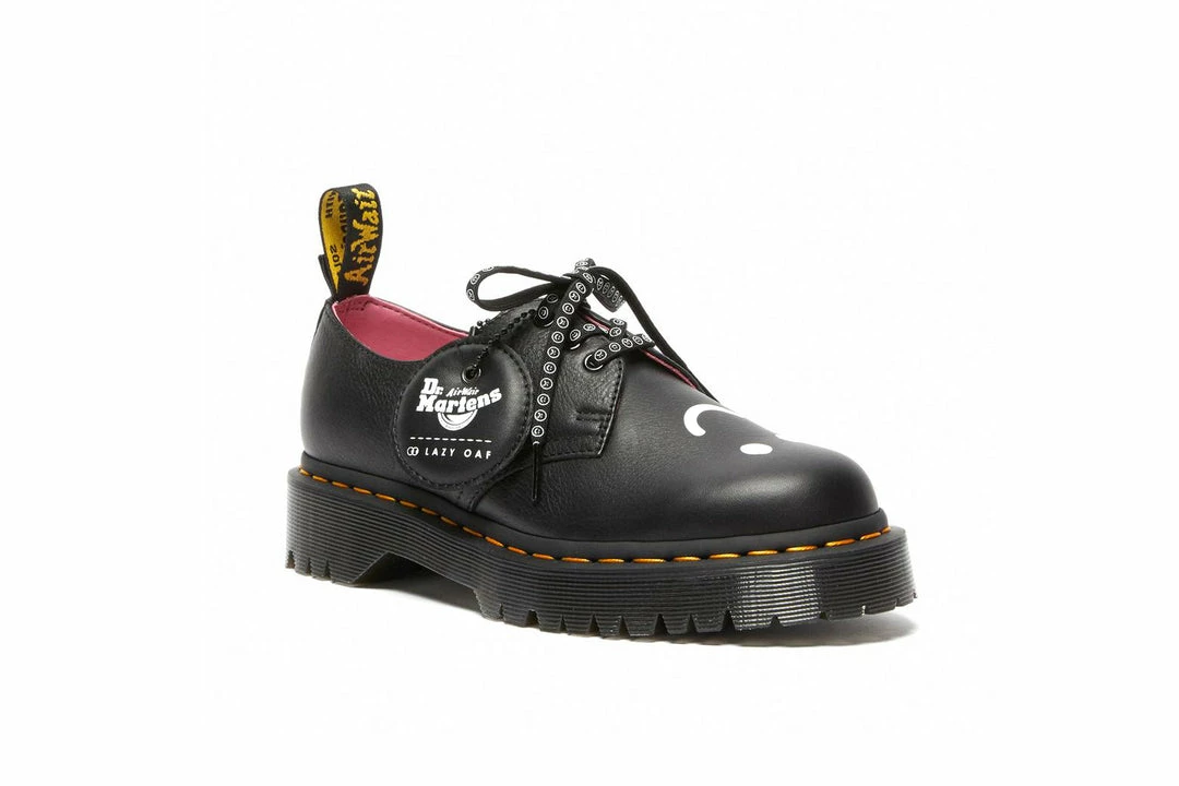 Choose your mood. Built from easy-wearing black Pisa leather, our 1461 Bex Lo shoe is detailed withLazy Oaf’s signature screen-printed illustration on the vamp and backstrap, with a double heel loop and is set on a slightly higher Bex sole. Finished with a dual-branded sock liner, black eyelets, our iconic yellow welt stitching and comes with two sets of laces.